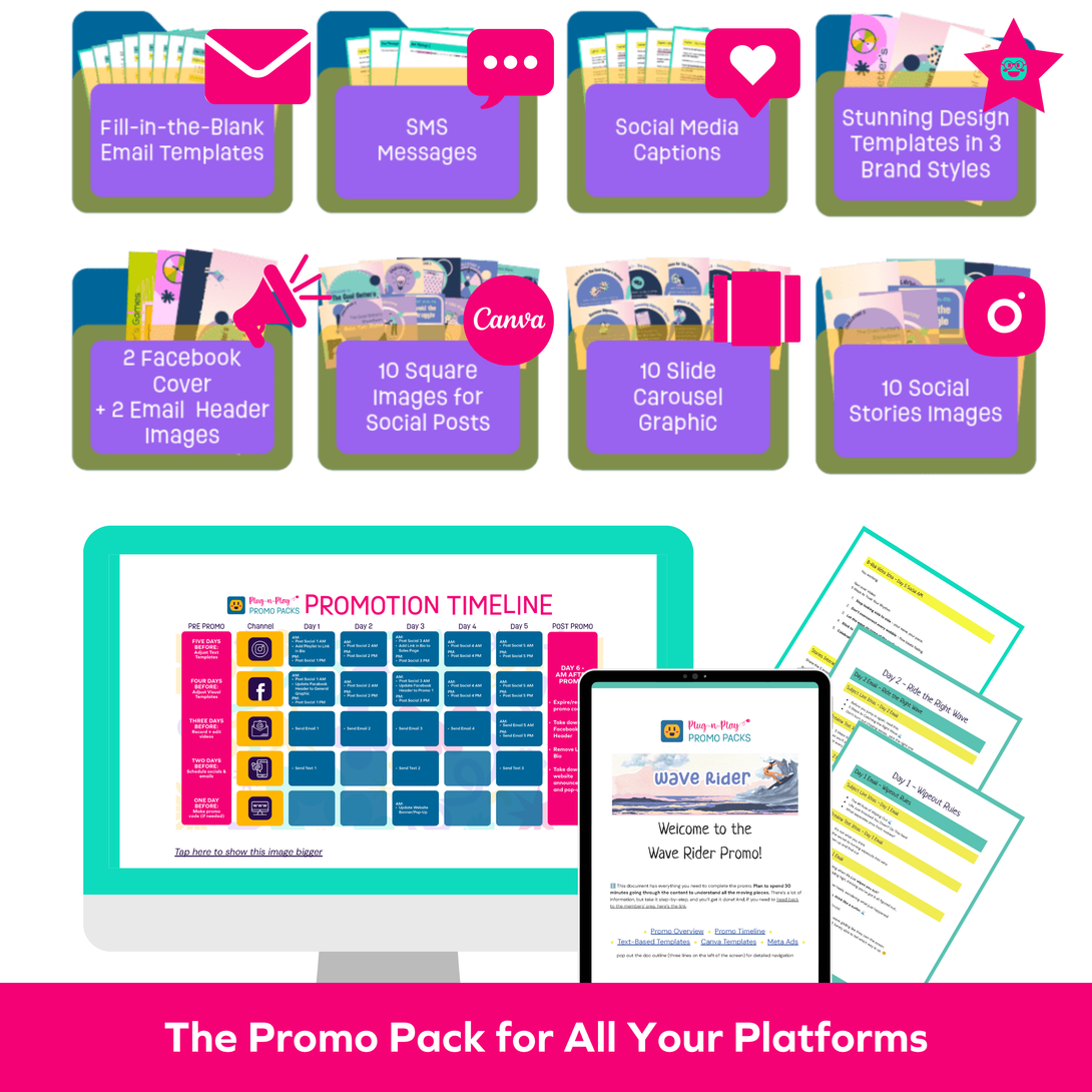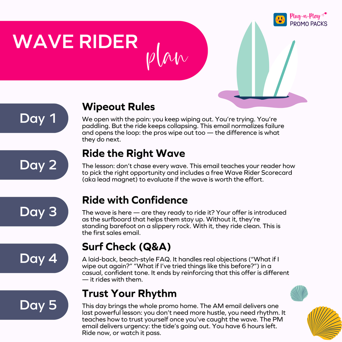 The Wave Rider Promo Pack is your 5-day marketing campaign that helps you stop chasing every shiny tactic and start riding the right wave — one that actually gets you to the shore (aka sales). It’s high-energy, strategic, and seriously fun to run.